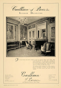 This is an original 1930 black and white print ad for Carlhian of Paris, Inc., Interior Decorators, 598 Madison Avenue, NYC. Shown here is an early Directoire Room (circa 1780).