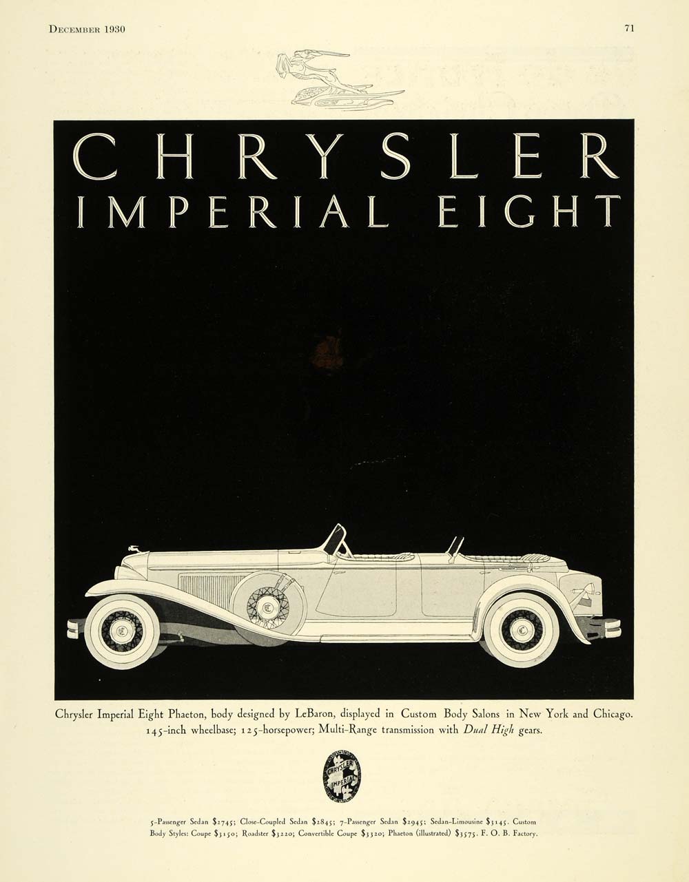 This is an original 1930 black and white print ad for Chrysler Motor Cars, featuring the Chrysler Imperial Eight Phaeton vehicle model with a body designed by Le Baron, which was displayed at custom body salons in New York and Chicago.