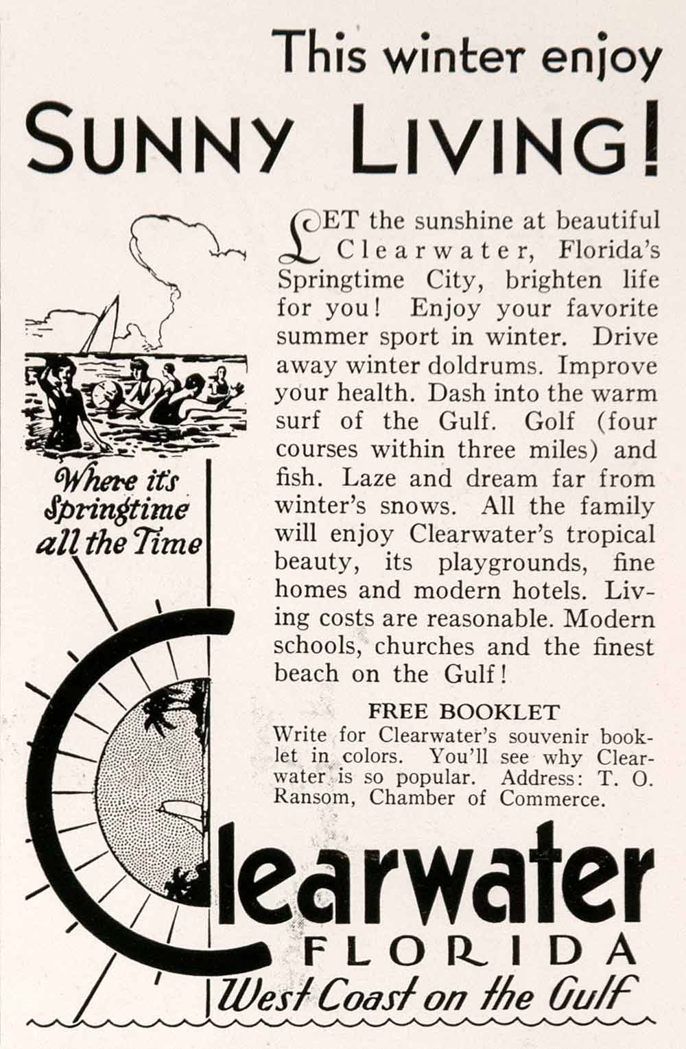 This is an original 1930 black and white print ad encouraging travel and tourism in Clearwater, Florida.