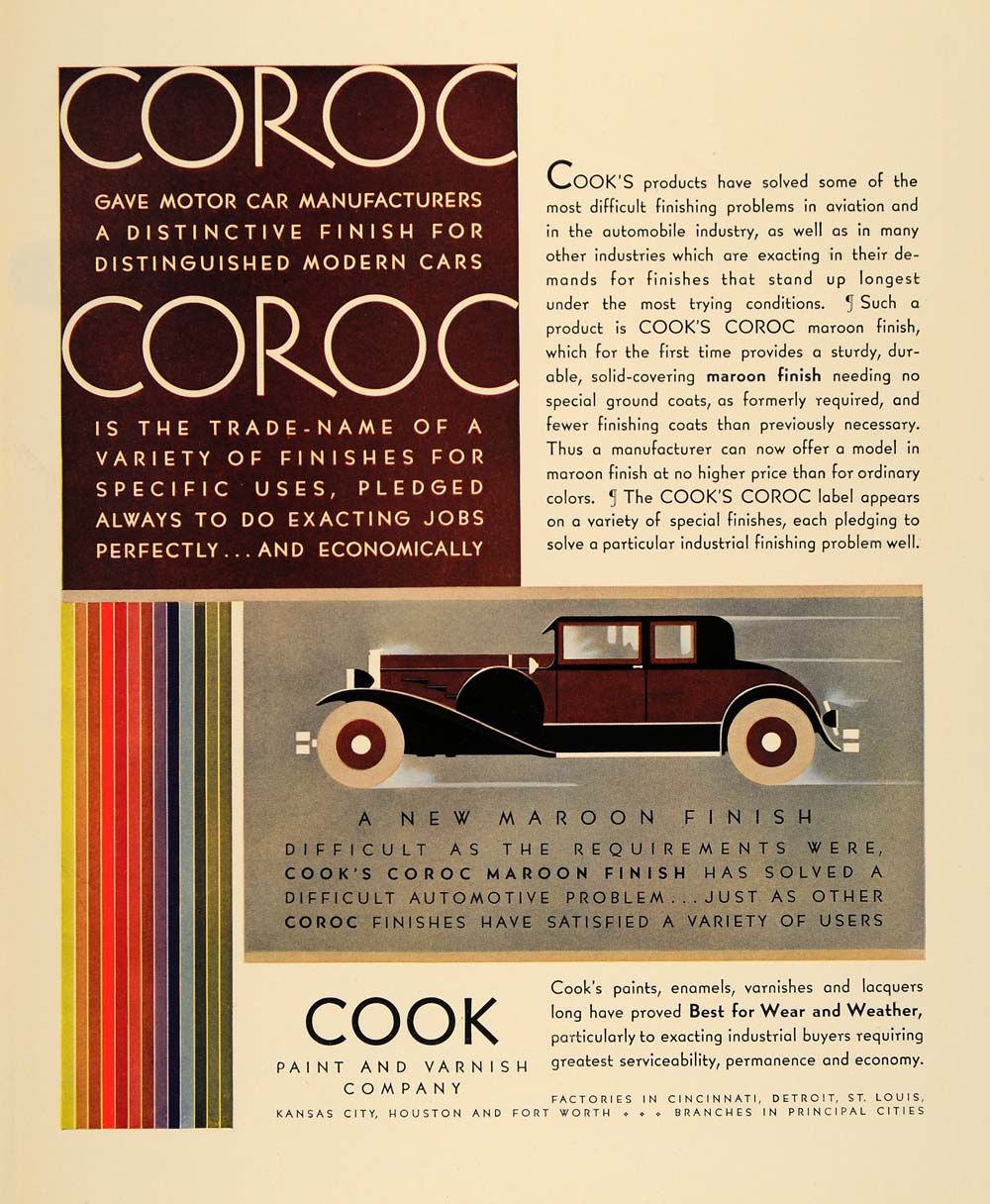 This is a nice art deco styled original 1930 color print ad for the Cook Paint and Varnish Company located in Cincinnati, Ohio.