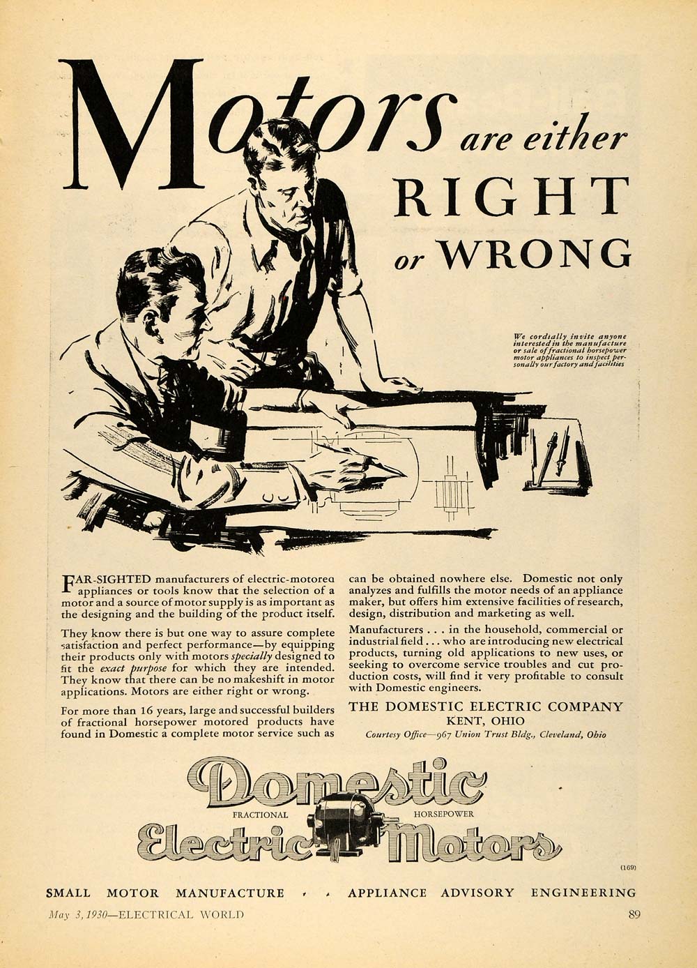 This is an original 1930 black and white print ad for Domestic Fractional Horsepower Electric Motors by The Domestic Electric Company of Kent, Ohio. The Domestic Electric Company manufactures small motors and does appliance advisory engineering. Their courtesy office is located at 967 Union Trust Building, Cleveland, Ohio.