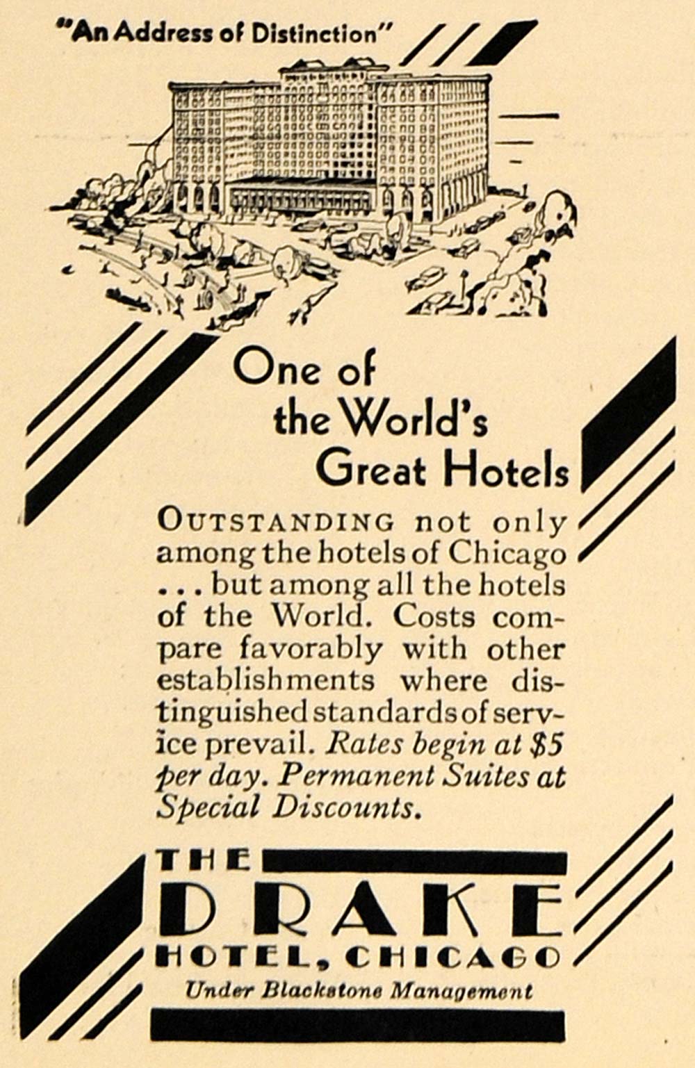 This is an original 1930 black and white print ad for the Drake Hotel of Chicago, Illinois. The hotel is still in existence and overlooks Lake Michigan.