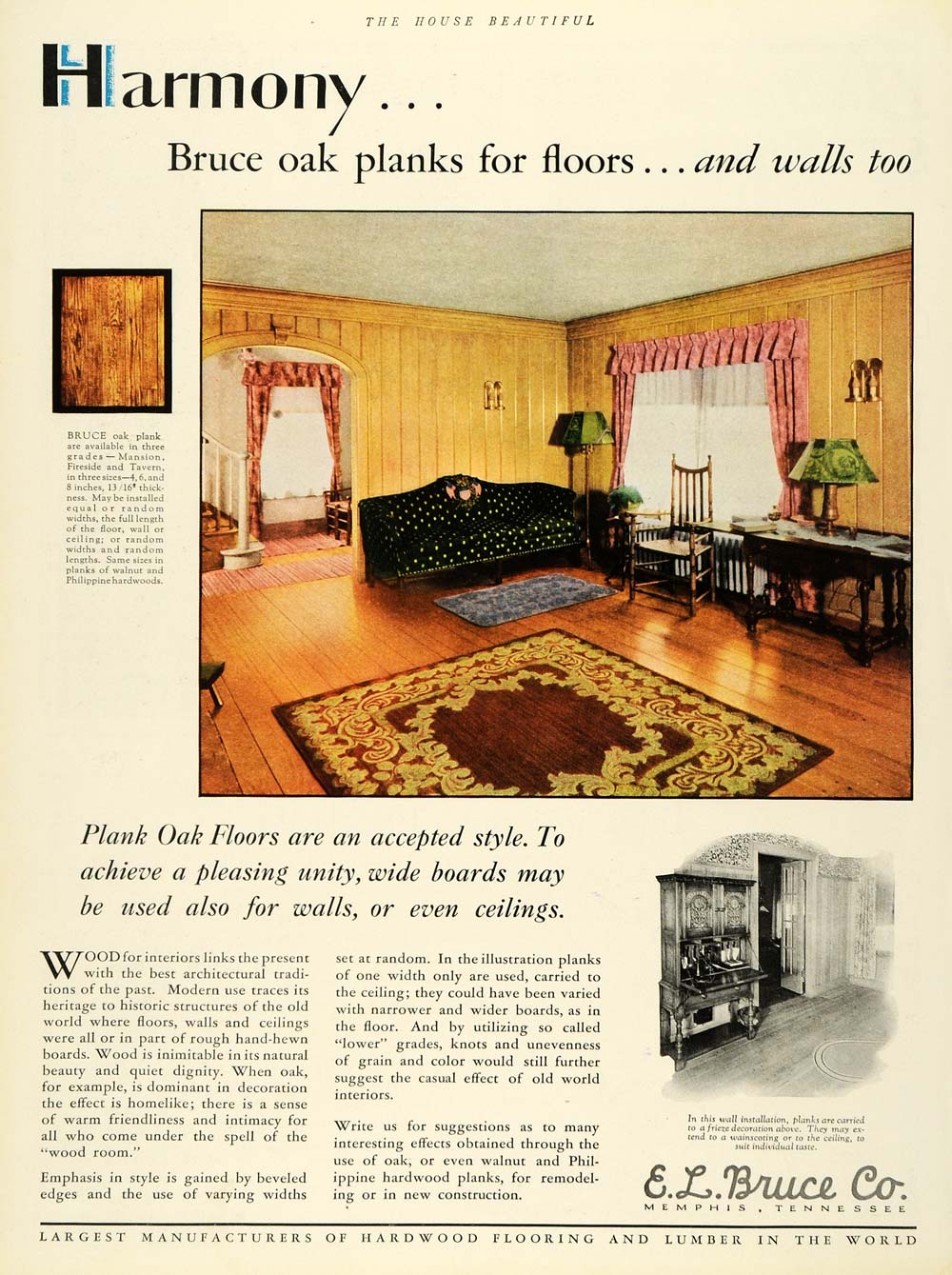 This is an original 1930 color print ad for hardwood flooring and lumber by the E. L. Bruce Company of Memphis, Tennessee.