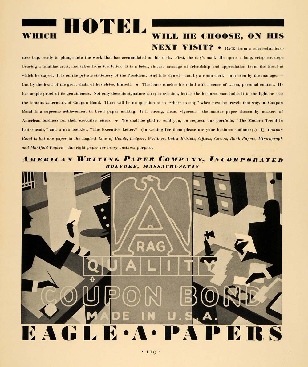This is an original 1930 black and white print ad for the American Writing Paper Company of Holyoke, Massachusetts.
