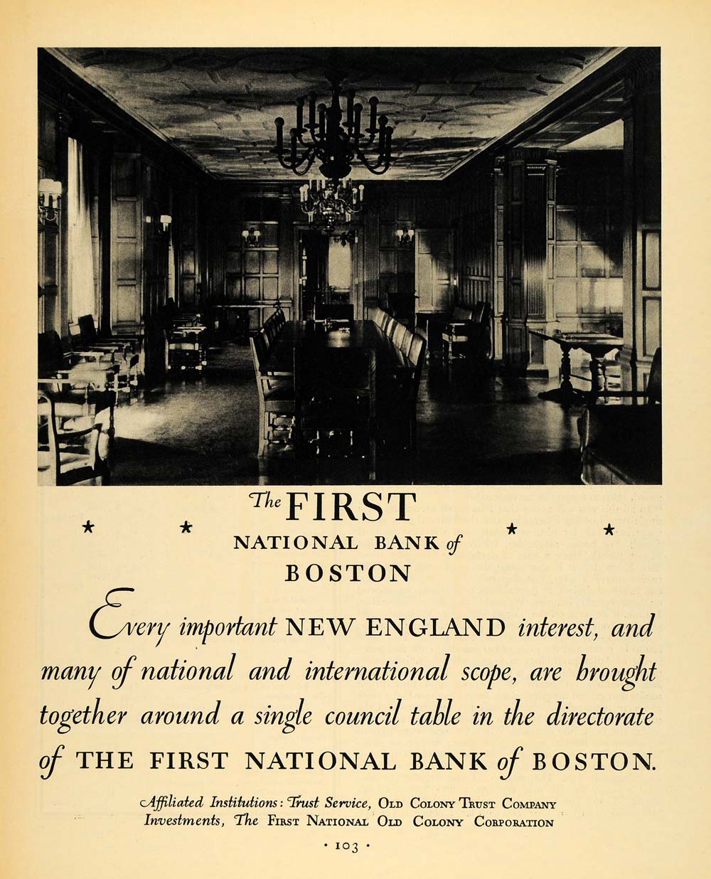 This is an original 1930 black and white print ad for the First National Bank of Boston, an affiliate of the Old Colony Trust Company and the First National Old Colony Corporation.