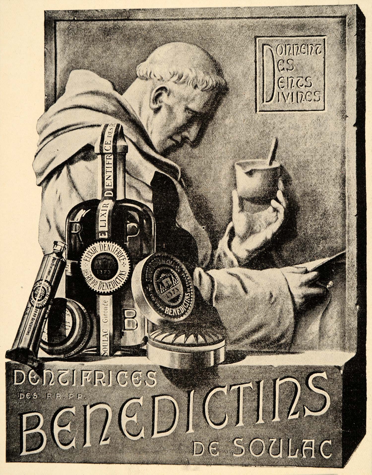 This is an original 1930 black and white print ad for Dentrifices Benedictins, toothpaste, mouthwash, and brushing powder.