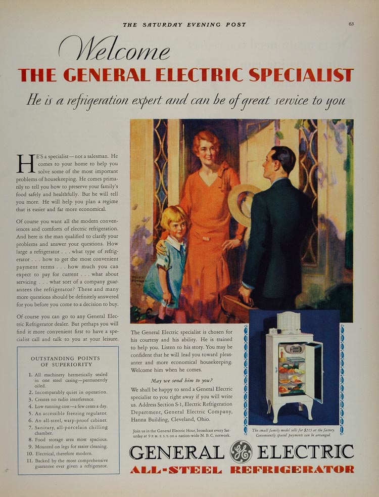 This is an original 1930 color print ad from General Electric featuring the helpful General Electric Specialist who "comes to your home to help you solve some of the most important problems of housekeeping." The ad has a nice illustration of a 1930's housewife.