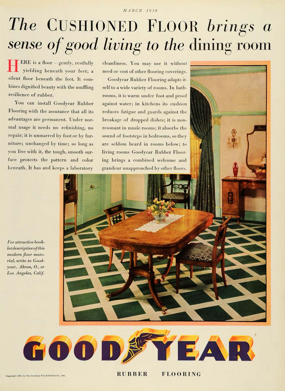 This is an original 1930 color print ad for the Goodyear Tire & Rubber Company, Incorporated, of Akron, Ohio, and Los Angeles, California; this ad features their Good Year Rubber Flooring for home decoration and improvement.