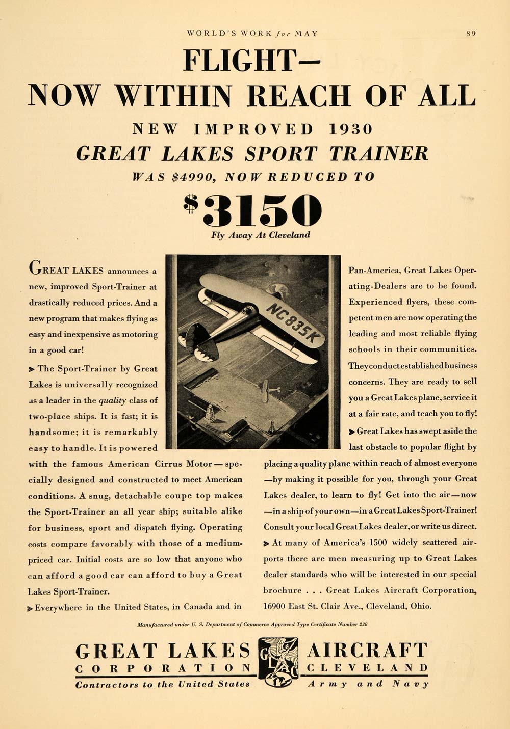 This is an original 1930 black and white print ad for the Great Lakes Aircraft Corporation of Cleveland (16900 East St. Clair Avenue), the contractors to the United States Army and Navy. This ad features their Great Lakes Sport Trainer Plane.