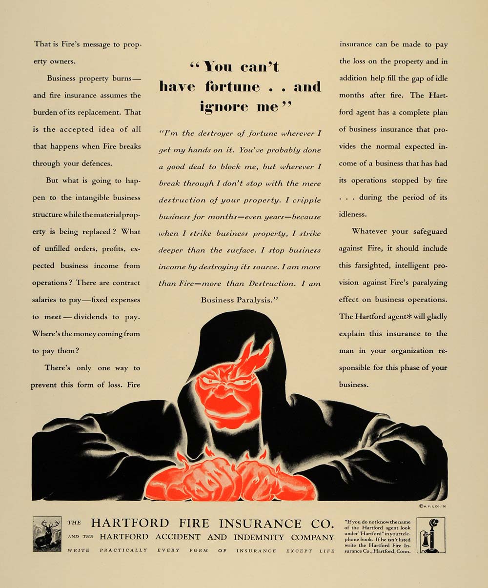 This is an original 1930 color print ad for the Hartford Fire Insurance Company.
