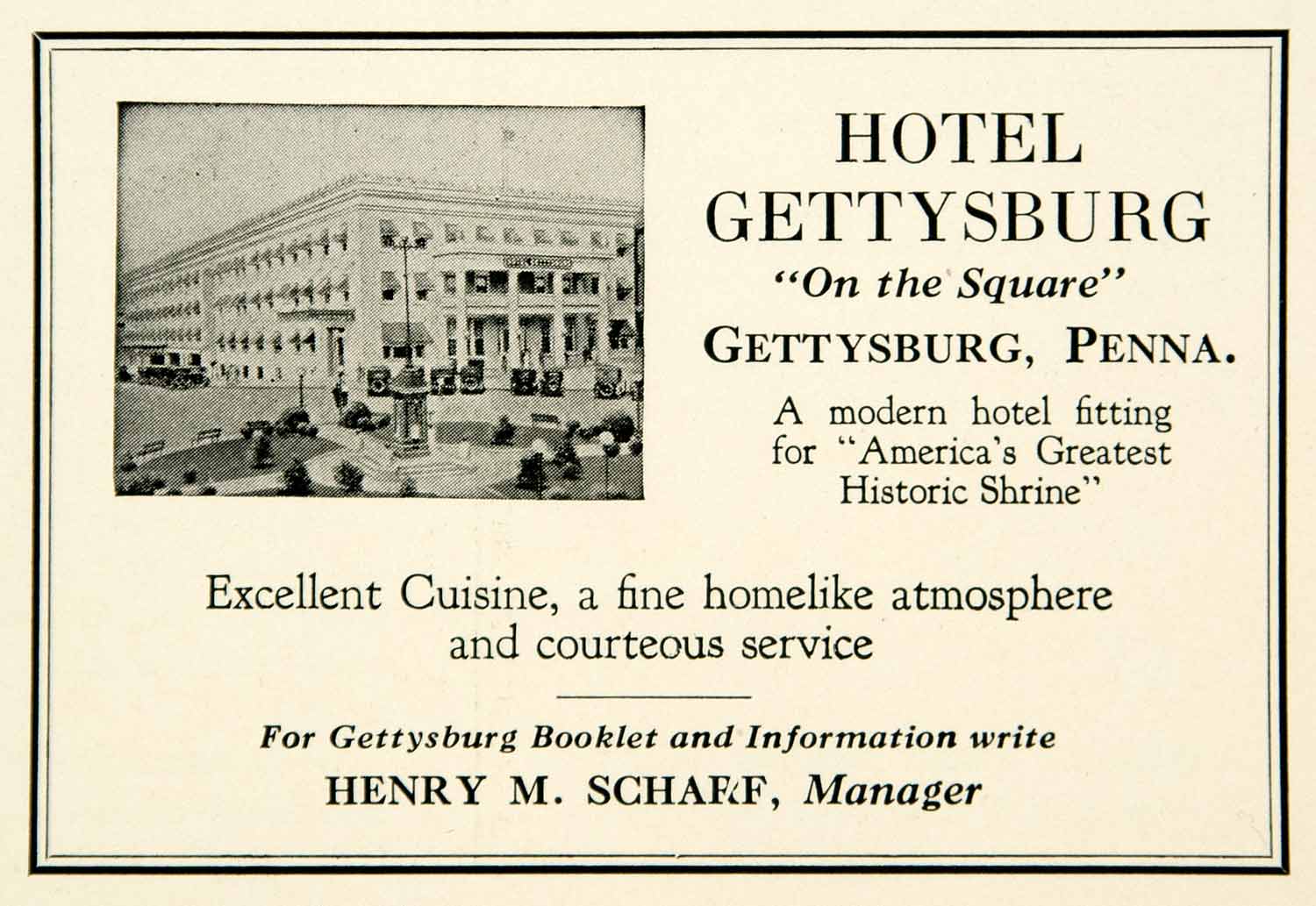 This is an original 1930 black and white print ad for the Hotel Gettysburg in Pennsylvania.