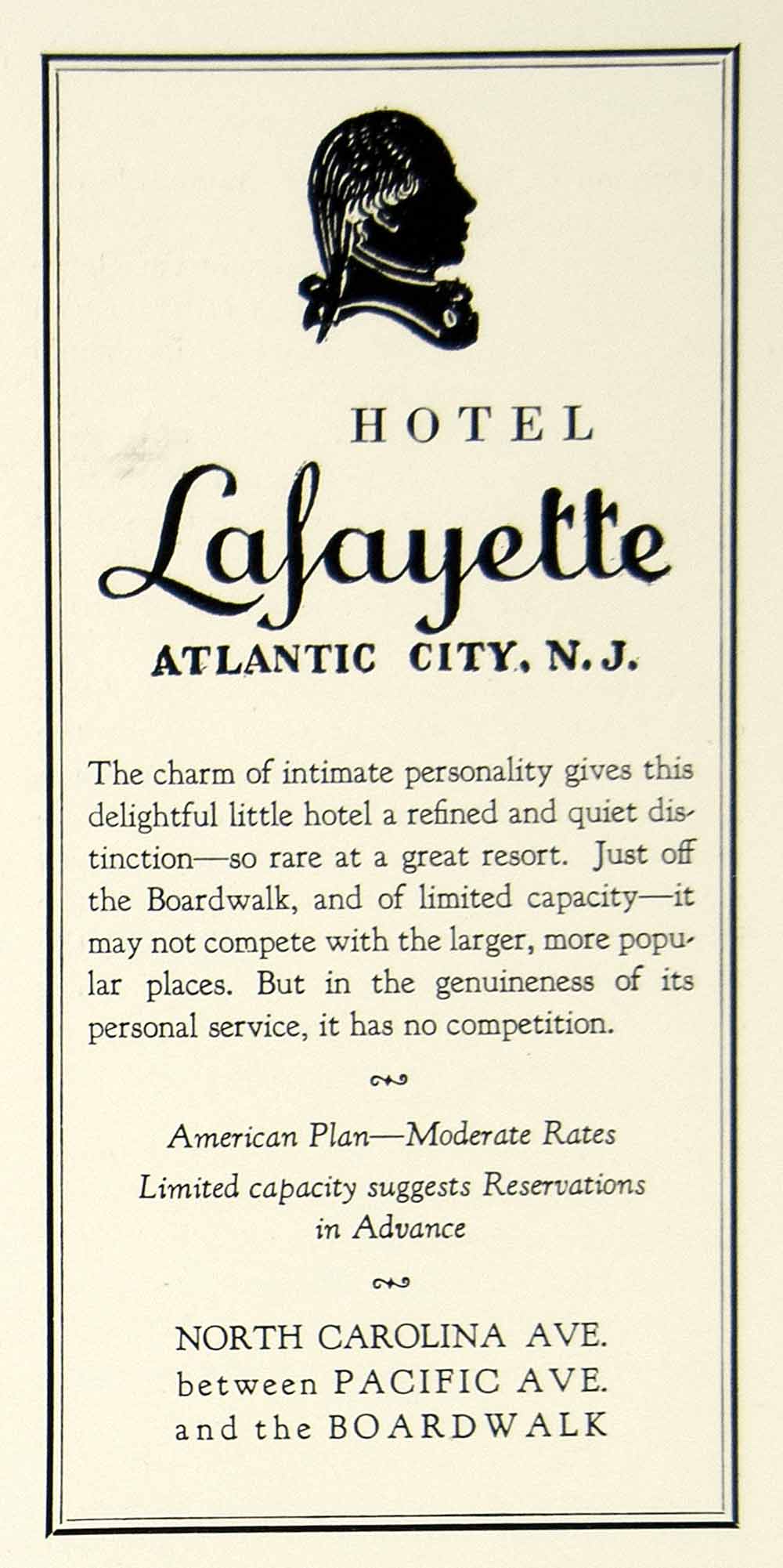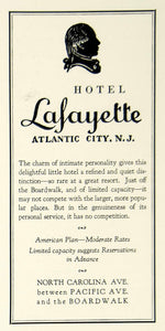 This is an original 1930 black and white print ad for the Hotel Lafayette in Atlantic City, New Jersey.