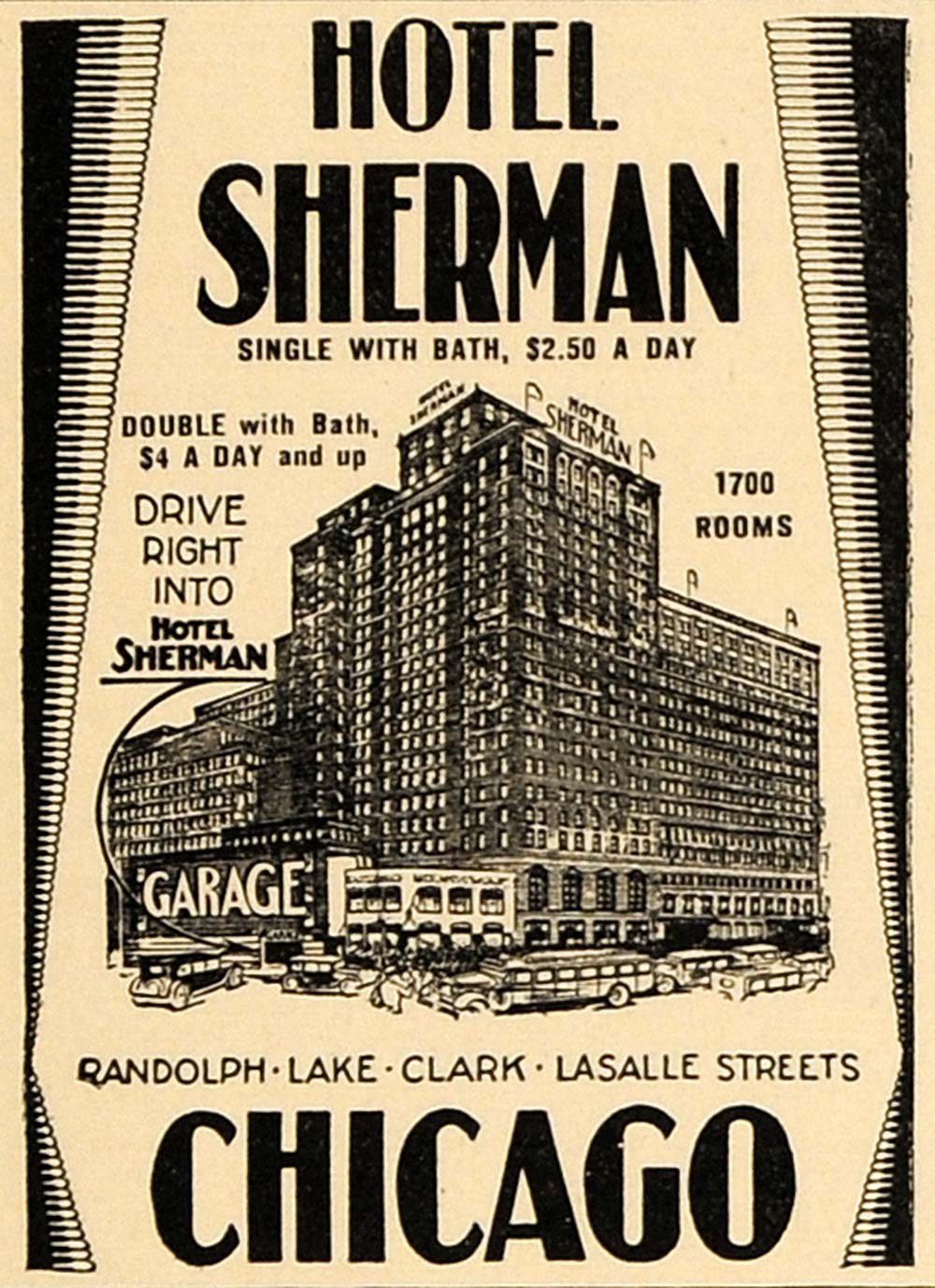 This is an original 1930 black and white print ad for Hotel Sherman located in Chicago, Illinois.
