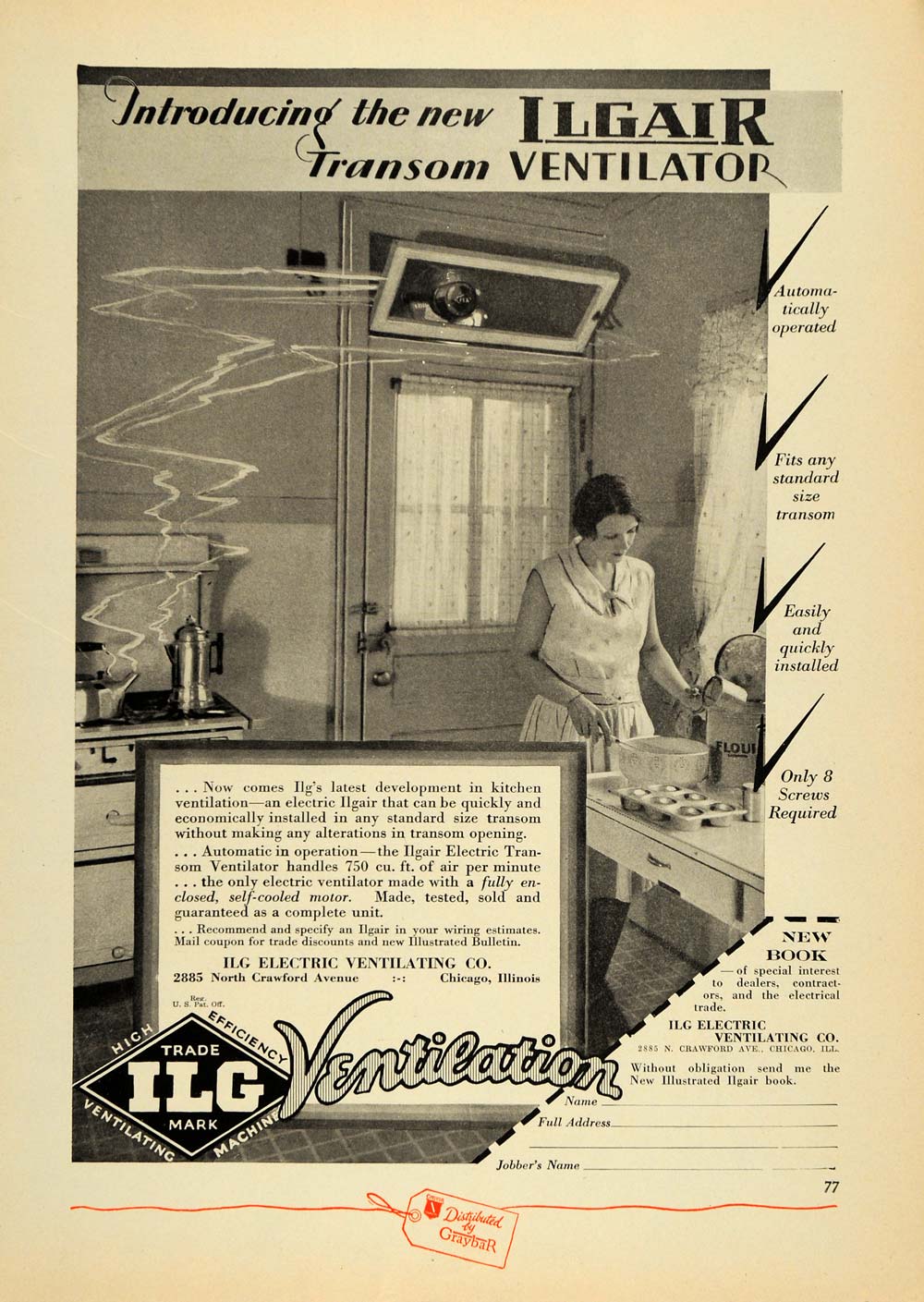 This is an original 1930 color print ad for the Ilgair Electric Transom Ventilator from ILG Electric Ventilating Company located at 2885 N. Crawford Avenue, Chicago, Illinois.