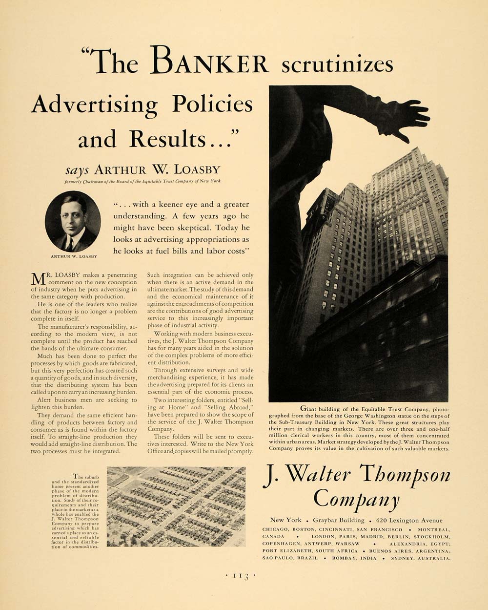 This is an original 1930 black and white print ad for the J. Walter Thompson Company. The ad features a quote from Arthur W. Loasby, former Chairman of the Board of the Equitable Trust Company of New York.