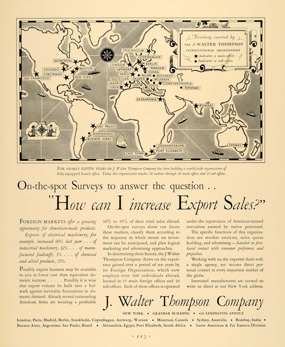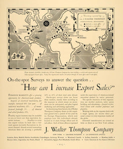 This is an original 1930 black and white print ad for the J. Walter Thompson Company. The ad features an image of the territory covered by the company.