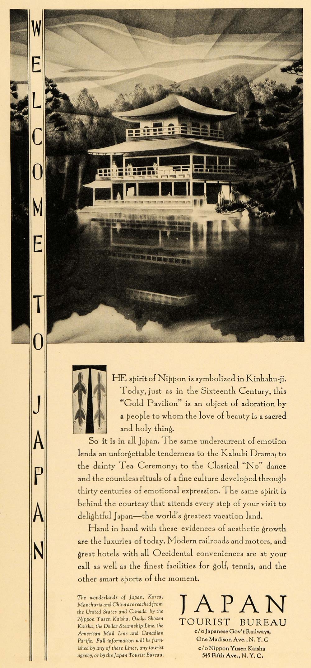 Keywords specific to this image: East, Eastern, travel, vacation, tourism, architecture, history, Nippon, Kinkaku-ji, Gold Pavilion, kabuki, Occidental, Japanese, orient, oriental Vintage Advertising