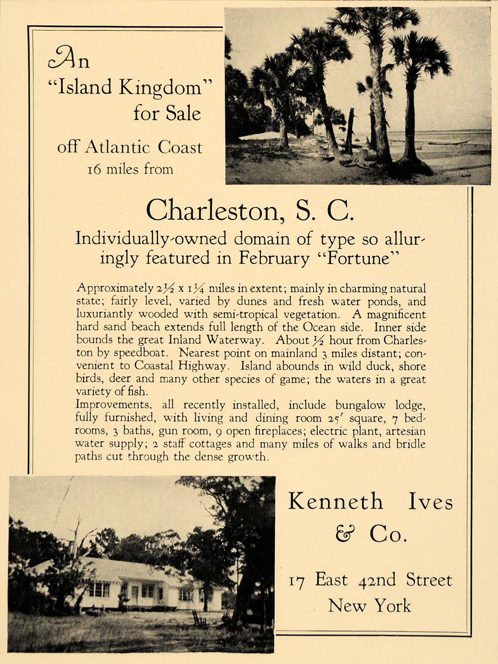 This is an original 1930 black and white print ad for an Island Kingdom for sale, off Atlantic Coast 16 miles from Charleston, South Carolina from Kenneth Ives & Company located at 17 East 42nd Street, New York.