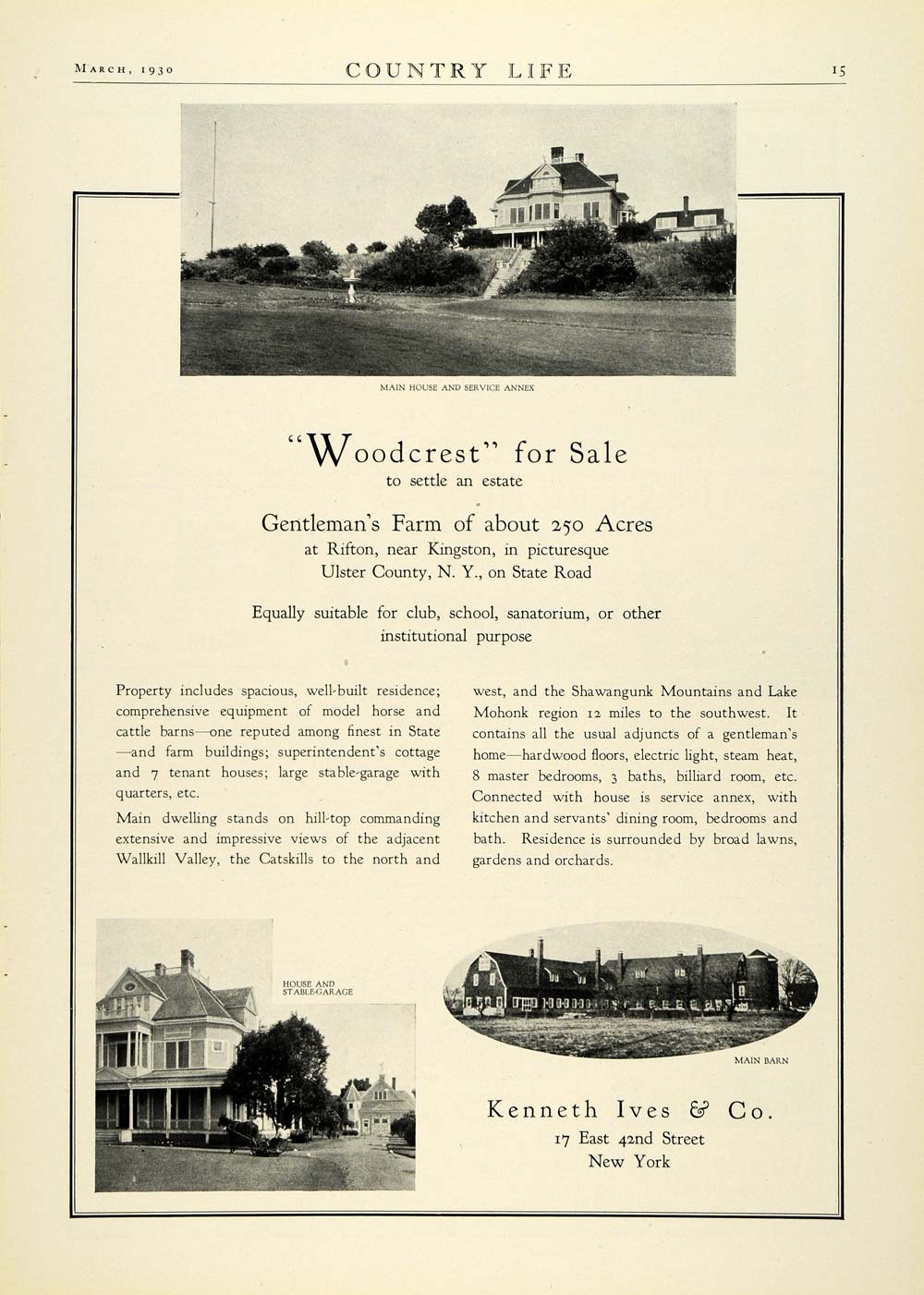 This is an original 1930 black and white print ad for real estate by Kenneth Ives and Company, located at 17 East 42nd Street in New York. This particular ad features the sale of the "Woodcrest" estate in Rifton, near Kingston in Ulster County, New York.