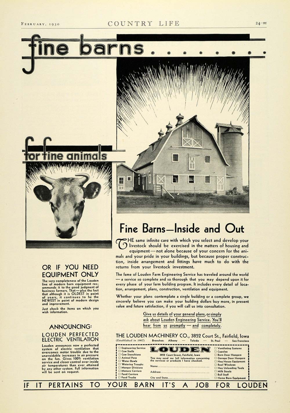 This is an original 1930 black and white print ad for agricultural equipment and machines by The Louden Machinery Company, located at 3852 Court Street in Fairfield, Iowa.