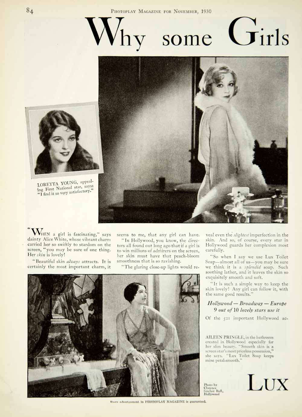 This is an original 1930 two-page black and white print ad (two single-sided pages) for Lux Toilet Soap featuring several of Hollywood's movie stars: Loretta Young, Aileen Pringle, Alice White, and Dorothy Mackaill. Please see both images.