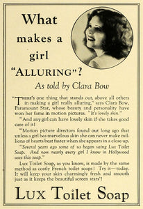 This is an original 1930 black and white print ad for Lux Toilet Soap, specially featuring Paramount star American actress Clara Bow.