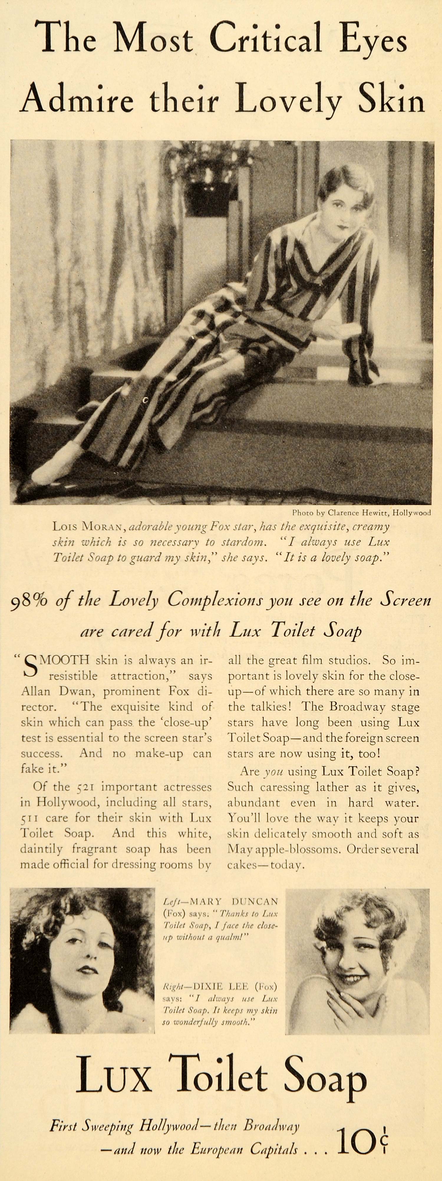 This is an original 1930 black and white print ad promoting the Lux Toilet Soap. This ad features young Fox Stars: Louis Moran, Mary Duncan, and Dixie Lee. Photo by Clarence Hewitt, Hollywood.