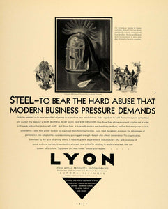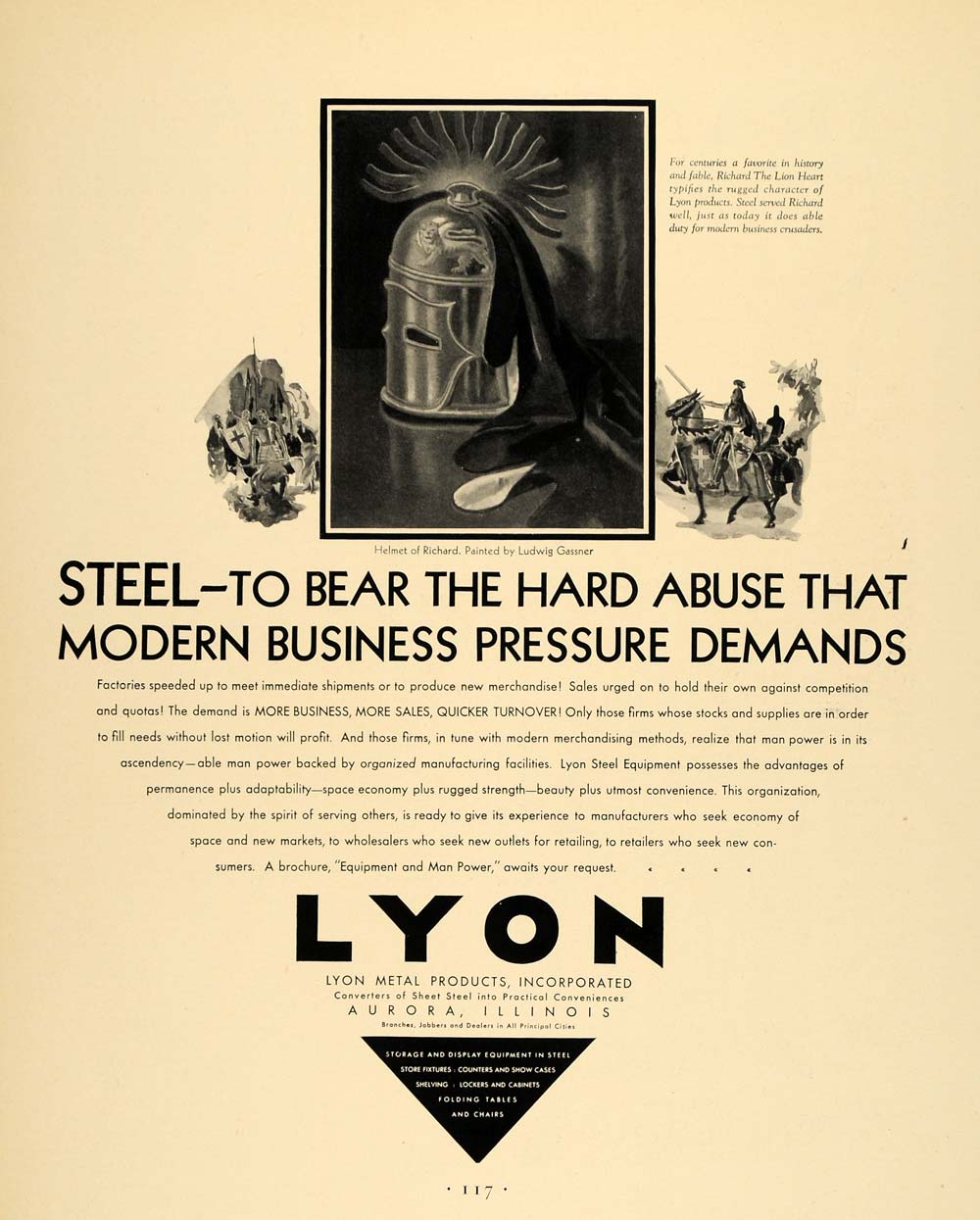 This is an original 1930 black and white print ad for Lyon Metal Products, Incorporated from Aurora, Illinois. The ad features an image of the Helmet of Richard, painted by Ludwig Gassner.