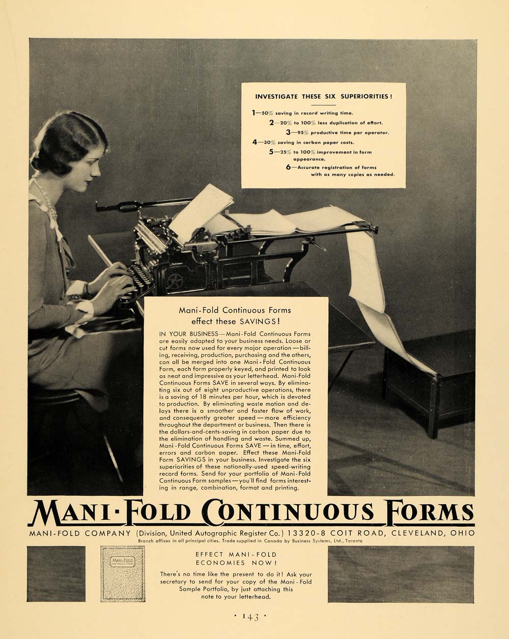 This is an original 1930 black and white print ad for Mani-Fold Continuous Forms from the Mani-Fold Company, a division of United Autographic Register Company.