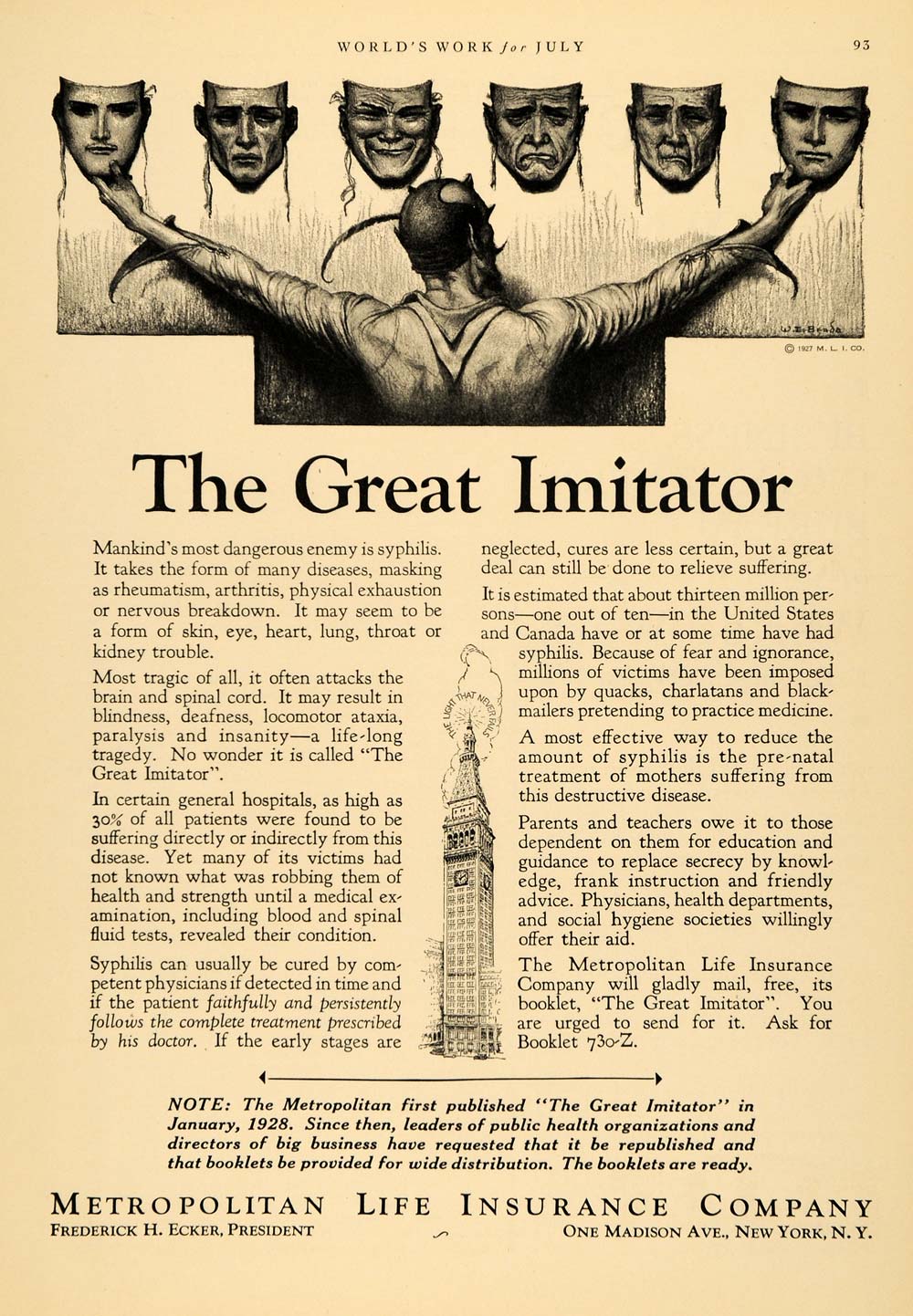 This is an original 1930 black and white print ad for the Metropolitan Life Insurance Company, located at One Madison Avenue in New York City, New York. Their President is Frederick H. Ecker, and this ad features their insurance policies to protect people and their families from dangers such as syphilis. The beautiful artwork in this ad is by the artist Theodor Wladyslaw Benda.