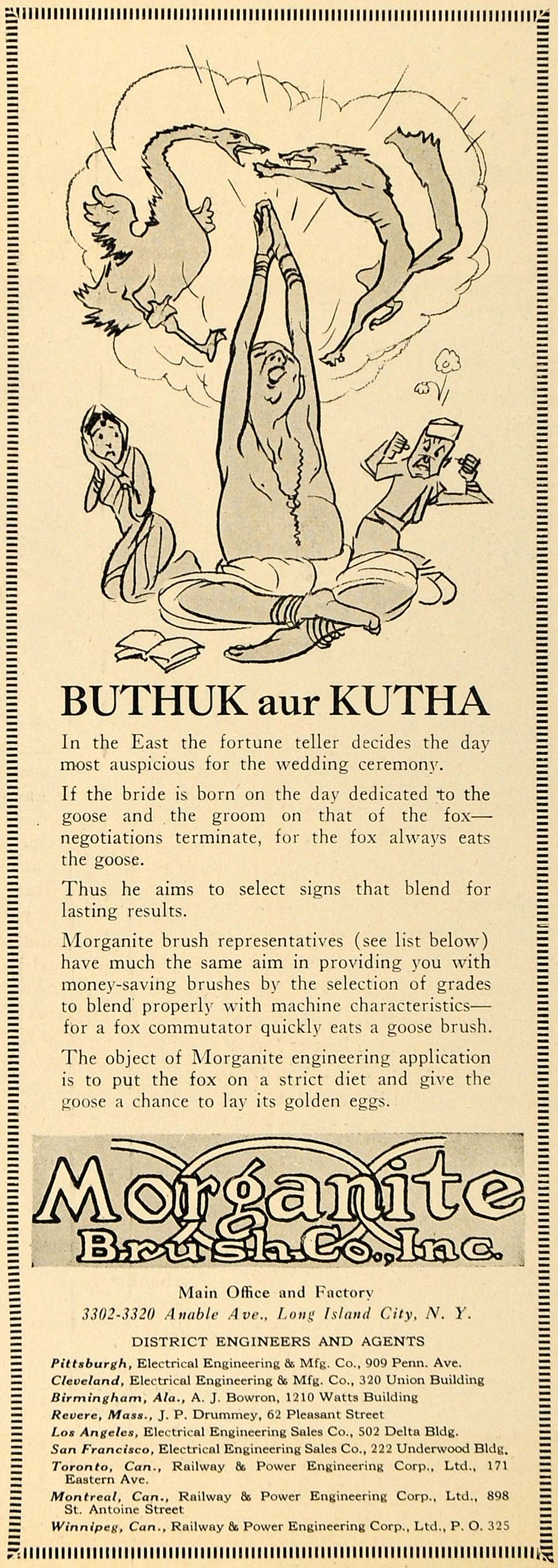 This is an original 1930 black and white print ad for the Electrical Carbon Brushes from Morganite Brush Company, Incorporation located at 3302-3320 Anable Avenue, Long Island City, New York.