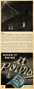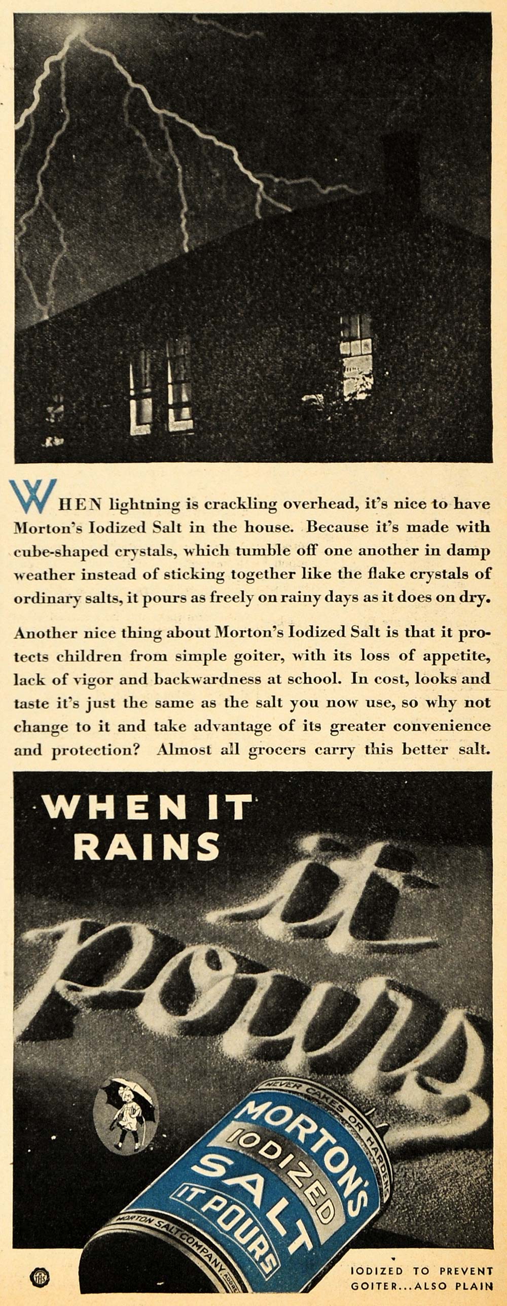 This is an original 1930 black and white print ad for Morton's Iodized Salt, a cube-shaped crystal salt that won't stick together in moist environments.