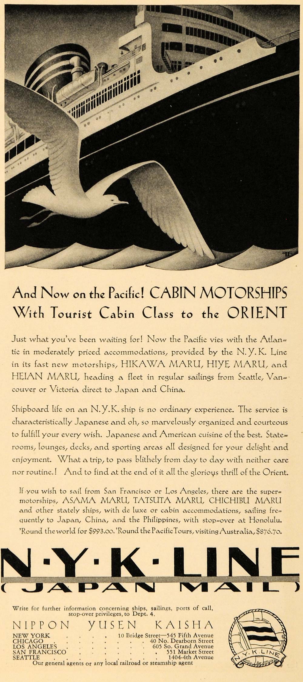Keywords specific to this image: N. Y. K., steamship, vacation, transport, Japanese, East, Eastern, Oriental, pricing, 605 So. Grand Avenue, 551 Market Street, 1404 4th Avenue, Asama Maru, Tatsuta Maru, Chichibu Maru, ocean, seagull, gull, seabird, waves Vintage Advertising