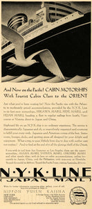 This is an original 1930 black and white print ad for the Nippon Yusen Kaisha Cruise Line, located at 10 Bridge Street and 545 Fifth Avenue in New York, and 40 No. Dearborn Street in Chicago. This ad features their Cabin Motorships that offer water travel to the Orient.