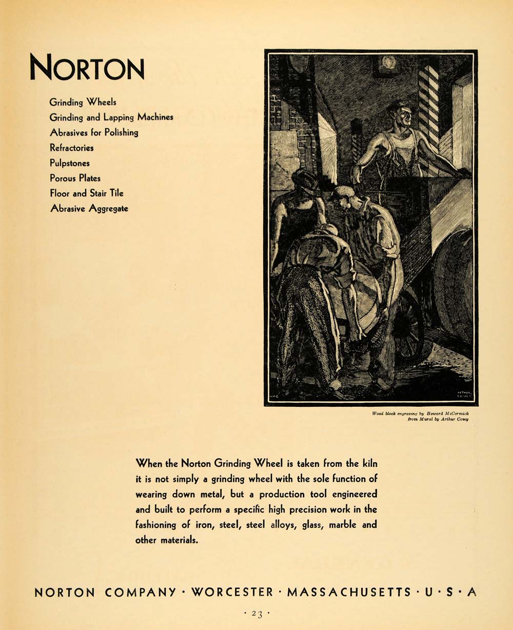This is an original 1930 black and white print ad for the Norton Company of Worcester, Massachusetts. The ad features a mural by Arthur Covey, and wood block engraved by Howard McCormick.