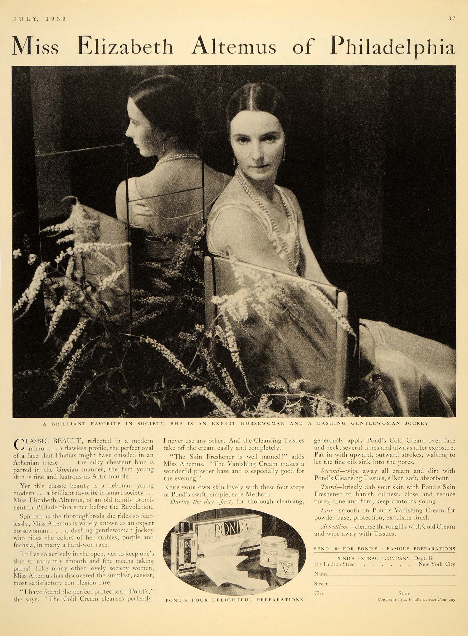 This is an original 1930 black and white print ad promoting the Pond's face products from Pond's Extract Company located at 149 Hudson Street, New York City. This ad features Miss Elizabeth Altemus of Philadelphia, a Jockey athlete.