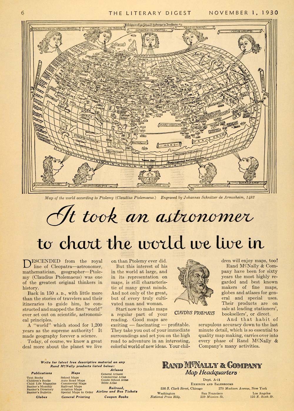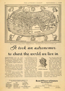 This is an original 1930 black and white print ad for Rand McNally maps, globes, and atlas, with an illustration of a map of the world according to Ptolemy (Claudius Ptolemaeus) which was engraved by Johannes Schnitzer de Armssheim, 1482.