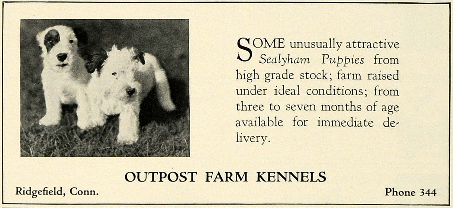 This is a small original 1930 black and white print ad for the sale of Sealyham Puppies by Outpost Farm Kennels in Ridgefield, Connecticut.