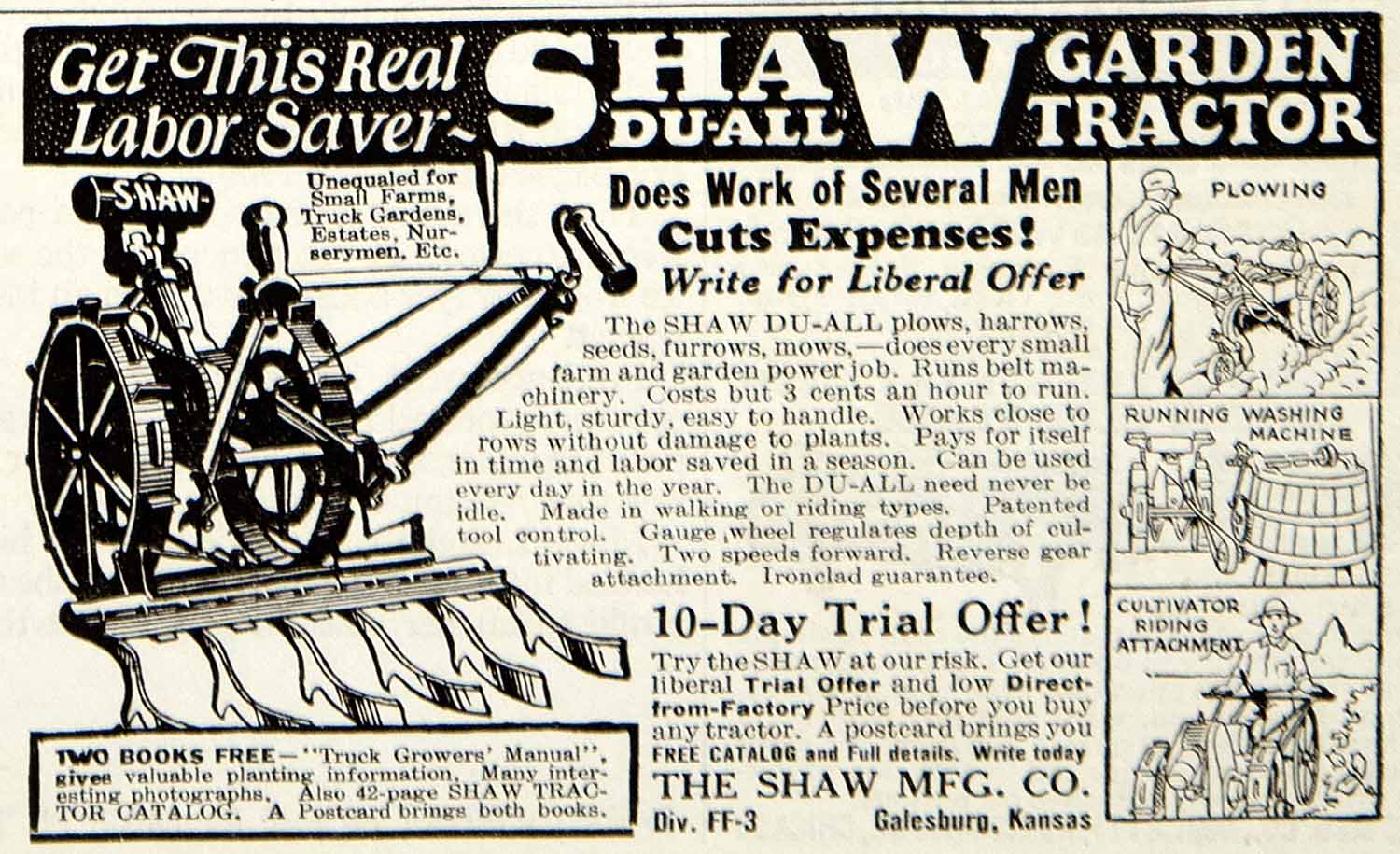 This is an original 1930 black and white print ad for the Du-All garden tractors that were made and sold by the Shaw Manufacturing Company of Galesburg, Kansas (KS).