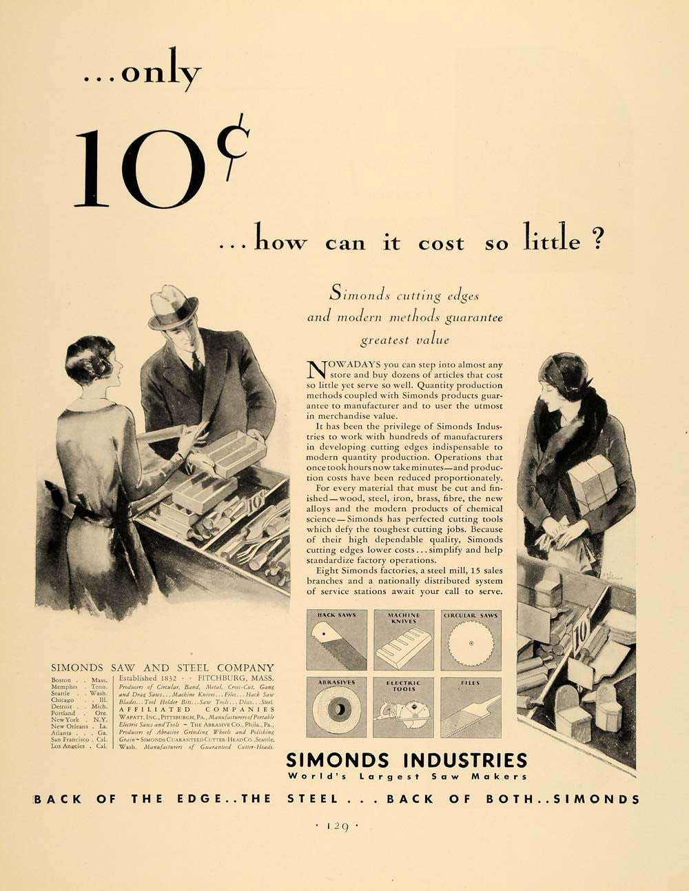 This is an original 1930 black and white print ad for Simonds Saw and Steel Company of Fitchburg, Massachusetts.