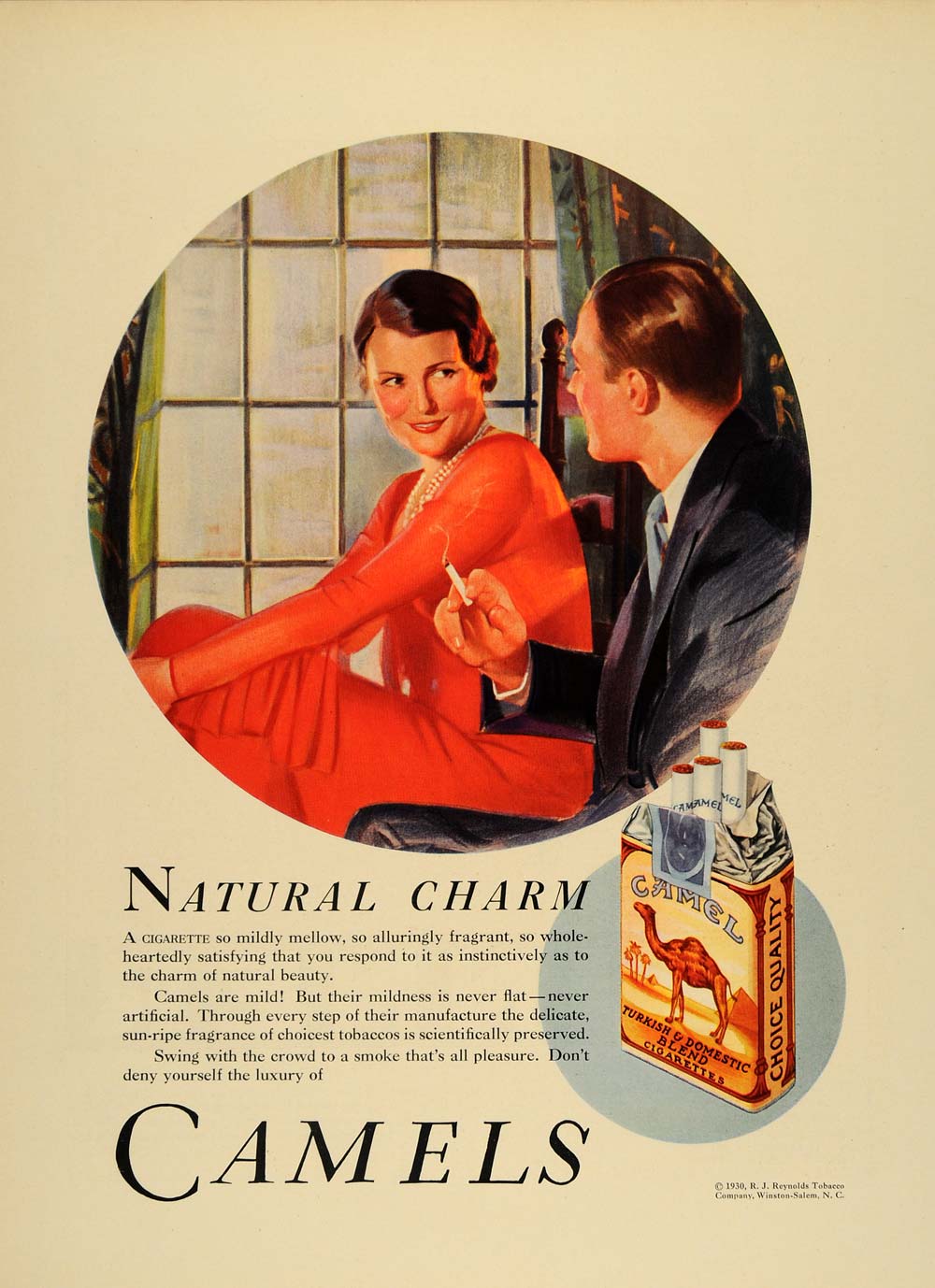 This is an original 1930 color print ad for Camel Turkish and Domestic Blend Cigarettes, from the R.J. Reynolds Tobacco Company in Winston-Salem, North Carolina. This ad is especially gorgeous due to its incredible illustrations.