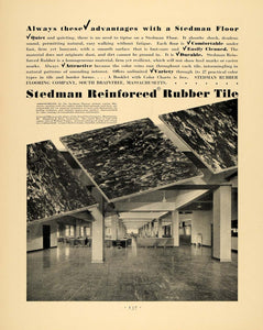This is an original 1930 black and white print ad for Stedman Reinforced Rubber Tile, featuring an image of Stedman Flooring in the Jewel Tea Company's plant, based in Barrington, Illinois. The Jewel Tea Company's plant employed architects Holabird and Root.