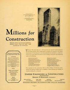 This is an original 1930 black and white print ad for the United Engineers and Constructors. The ad features an illustration of the 53-story Lincoln Building on 42nd Street at Madison Avenue in New York, with architecture and carpentry by E.J. Willingale, J.E.R., Kenneth B. Norton and Wm. Harmon Beers.