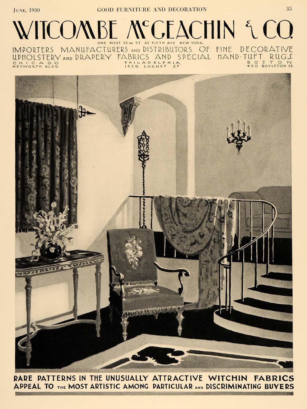 This is an original 1930 black and white print ad for the Witcombe McGeachin and Company's Drapery Fabrics,Decorative Upholstery and special hand-tuft rugs.