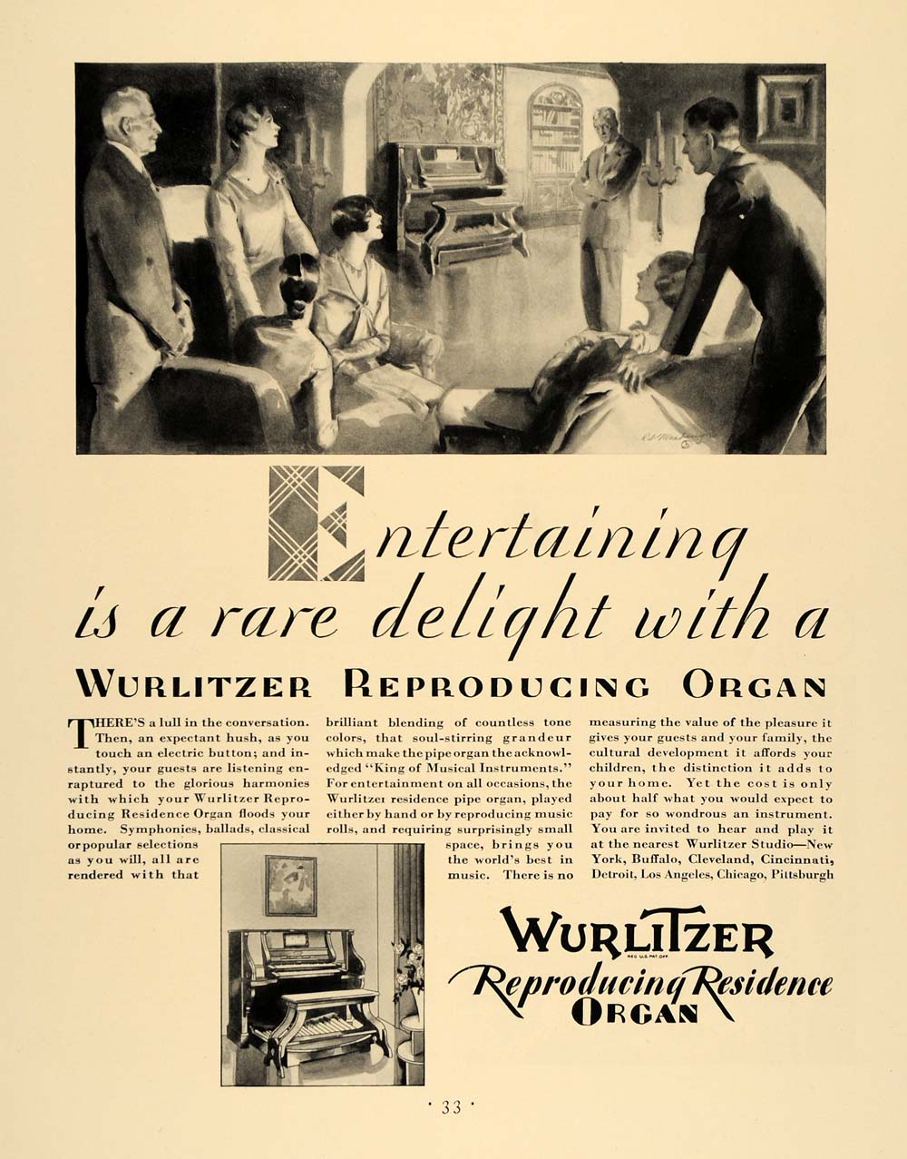 This is a wonderful original 1930 black and white print ad for the Wurlitzer Reproducing Residence Organ.
