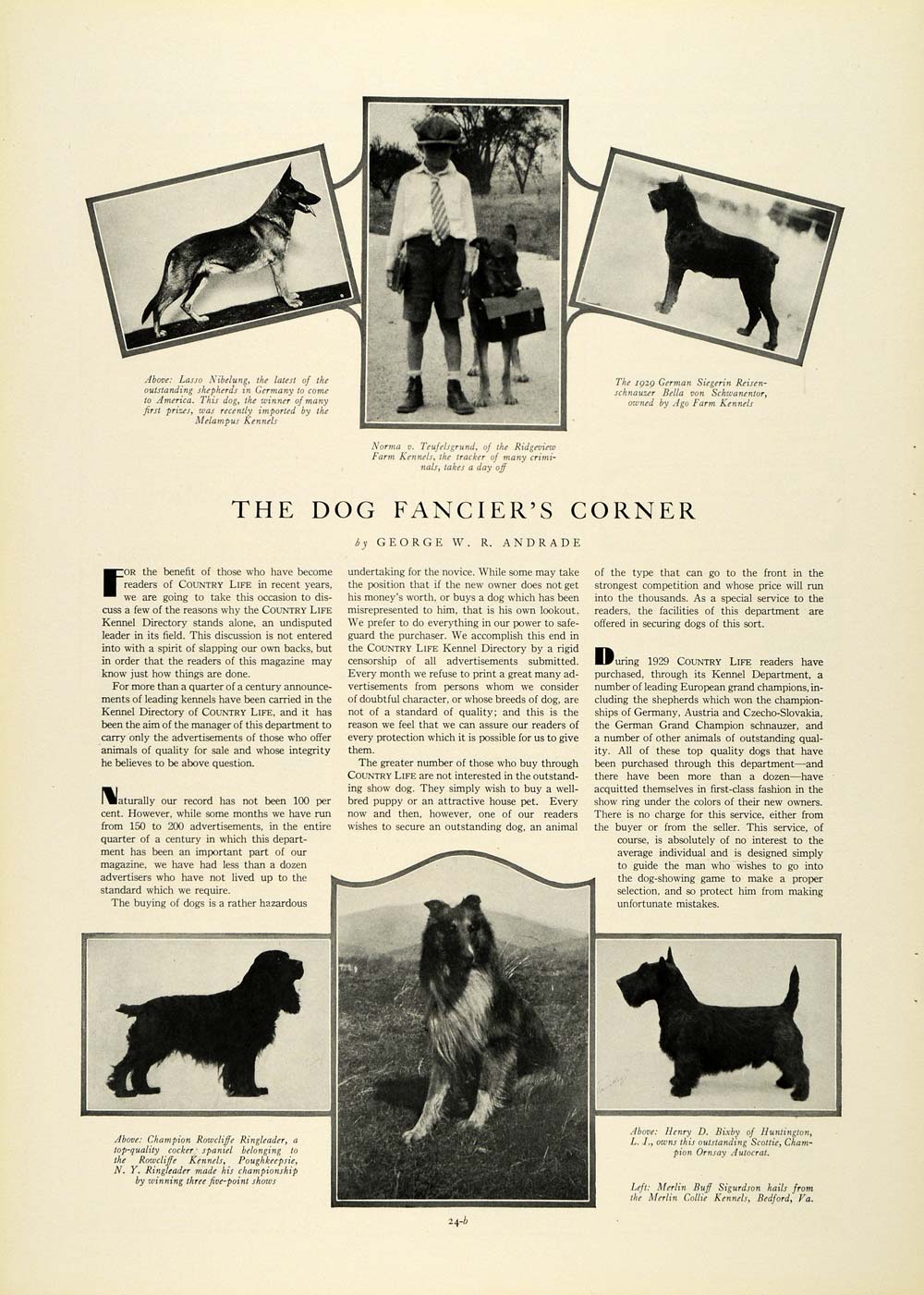 This is an original 1930 one-page article (one single-sided page) by Geroge W. R. Andrade on how to attain a champion canine. The prize dogs featured include the 1929 German Siegerin Reisenschnauser Bella von Schwanentor of Ago Farm Kennels, Norma von Teufelsgrund of Ridgeview Farm Kennels, Lasso Nibelung of Melampus Kennels, Rowcliffe Ringleader of Rowcliff Kennels, Ornsay Autocrat of the owner Mr. Henry D. Bixby and Merlin Buff Sigurdson of Merlin Collie Kennels in Bedford, Virginia.