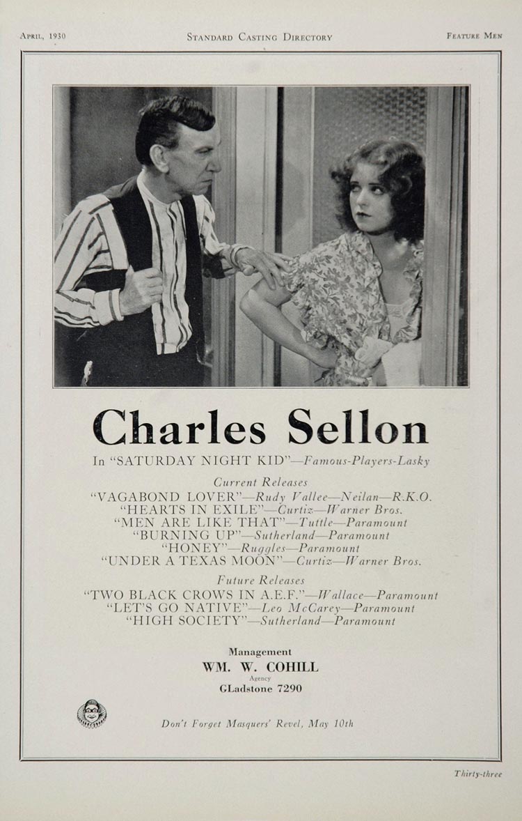 This is an original 1930 casting ad for Charles Sellon. He starred in many films, including "Saturday Night Kid," "Vagabond Lover," "Hearts in Exile," "Under a Texas Moon," "Let's Go Native," and "High Society."