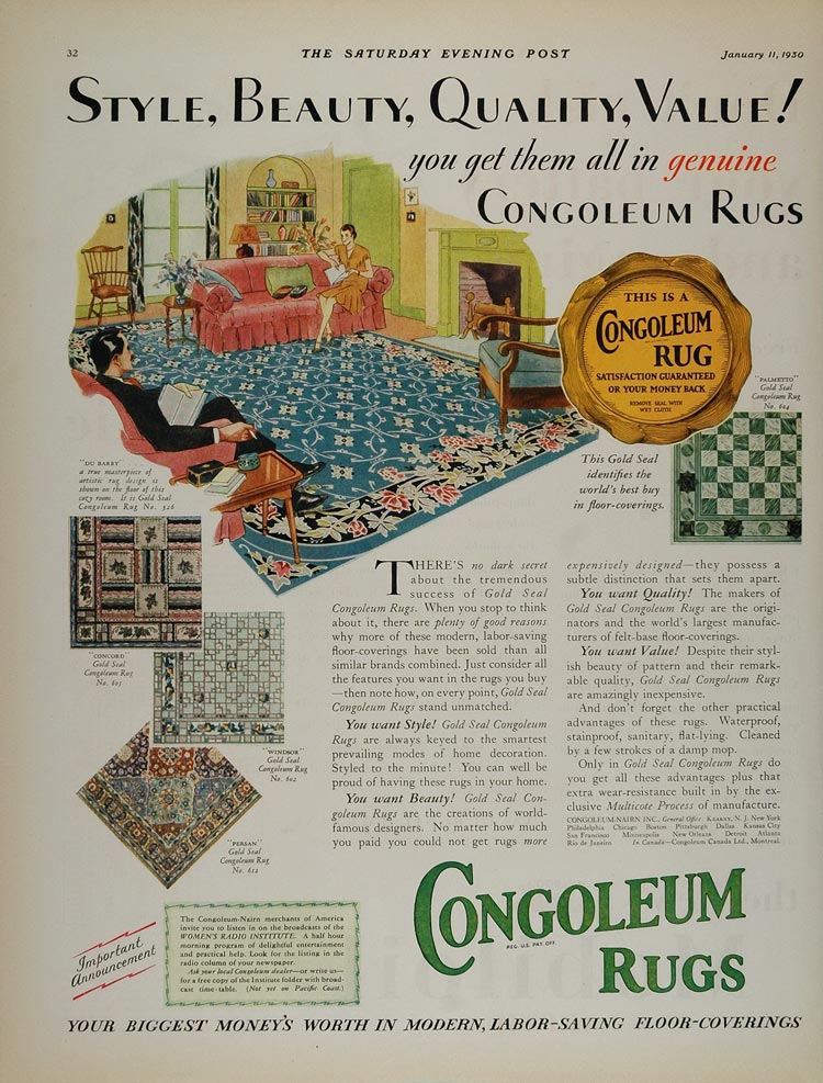 This is an original 1930 color print ad for Congoleum Gold Seal Rugs with an illustration of the "Du Barry" pattern as the floor covering in this classic late 1930's living room. Other patterns shown here are: "Concord" Gold Seal, "Windsor" Gold Seal, "Persan" Gold Seal, and "Palmetto" Gold Seal.