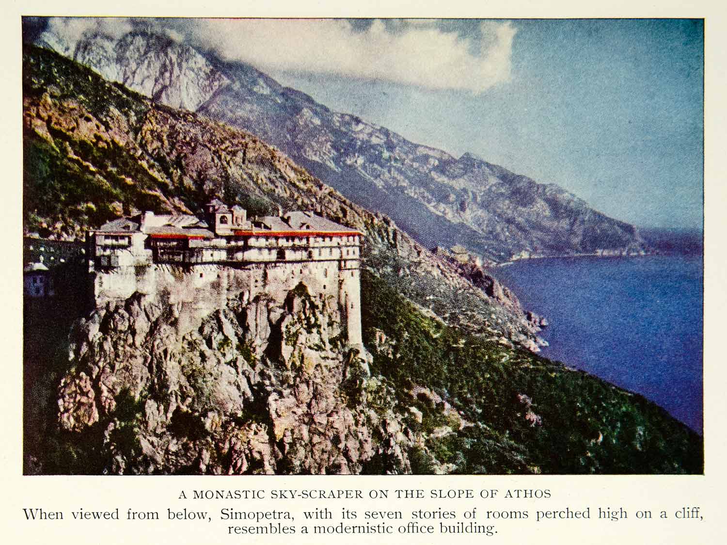 This is an original 1930 color print of the Simonopetra on the side of Mount Athos in Greece.