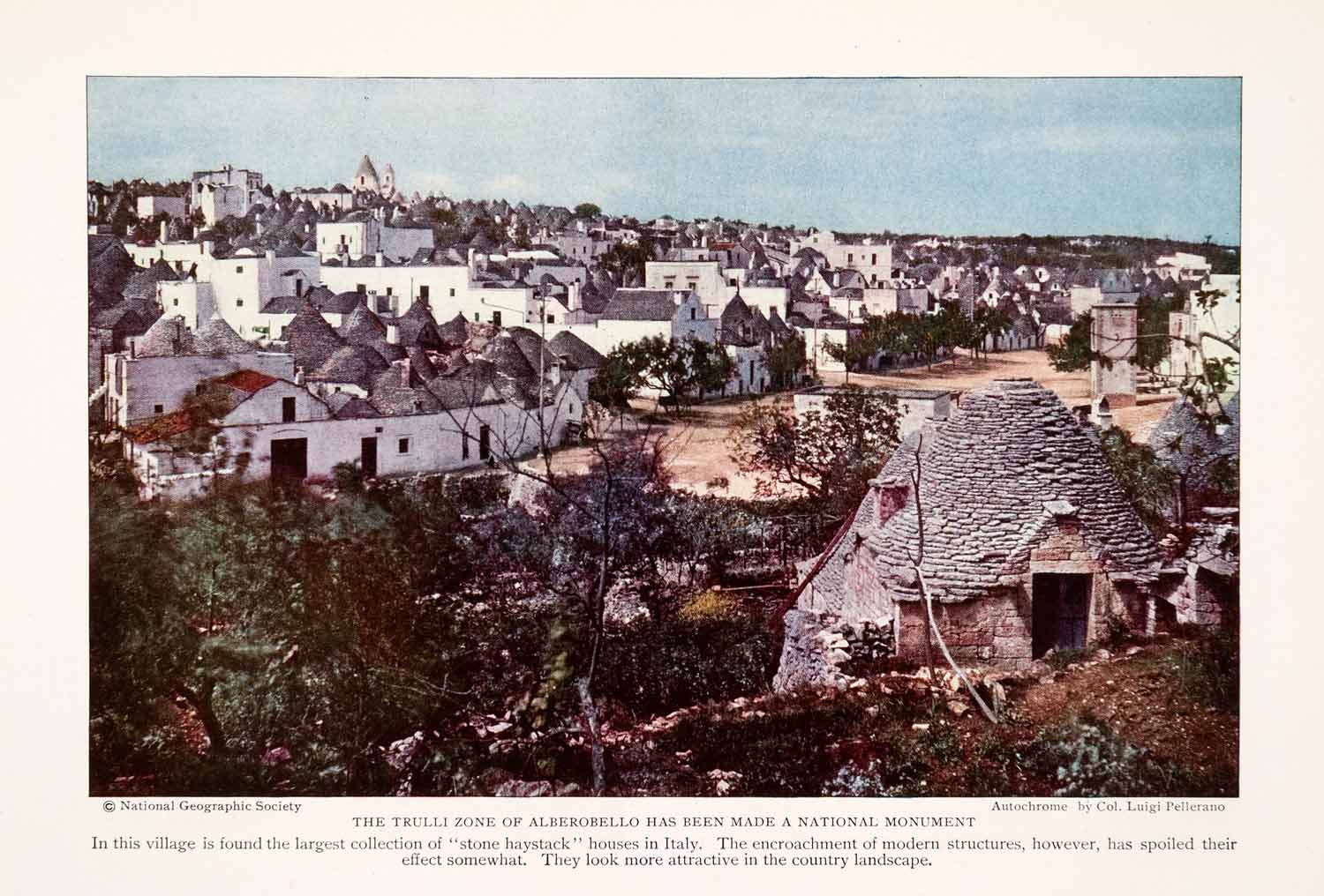 This is an original 1930 color print of stone haystack houses, as well as modern structures in the Trulli region of Alberobello in Italy. Photography courtesy of Colonel Luigi Pellerano.